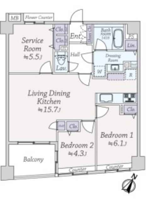 専有面積 69.60m2 バルコニー面積 5.15m2