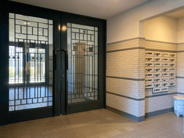 落ち着いたグレージュのタイル貼りが施された、5階建の低層レジデンス。エントランスはグリーンの庇とアイアン調の意匠が施された扉が印象的で、上品な佇まいを演出しています。TVモニター付オートロックで来訪者を画面で確認でき、安心感のある暮らしをサポート。共用部には防犯カメラが設置され、セキュリティ面にも配慮されています。宅配ボックスも備わっており、時間を気にせず荷物を受け取り可能です。