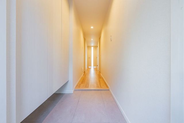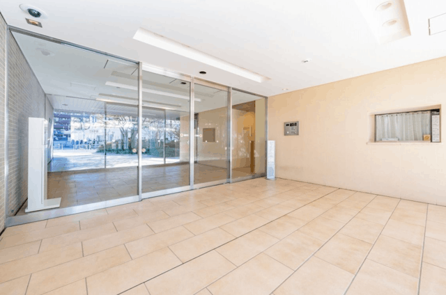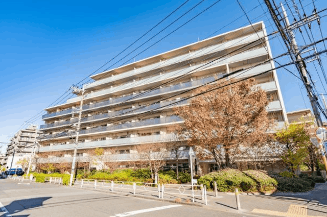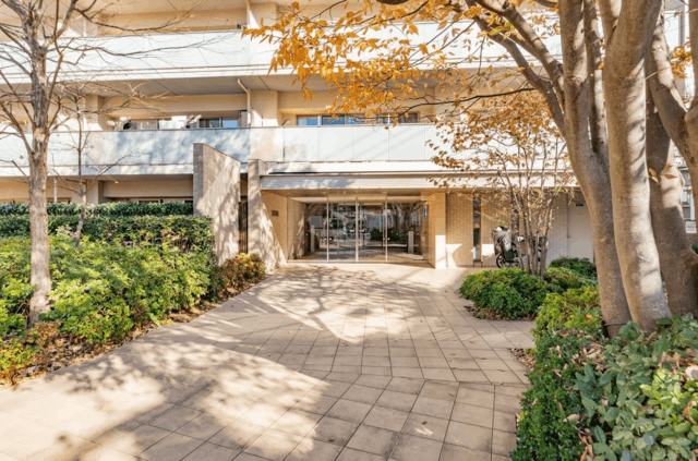 明るいベージュのタイル貼りで仕上げられた外観を持ち、エントランス周りには手入れの行き届いた植栽が配置された中規模マンション。鉄筋コンクリート造の建物構造で、エントランスにはオートロックが導入されています。宅配BOXも設置され、不在時の荷物受け取りに対応。建物内にはエレベーターが設けられ、上層階へのアクセスもスムーズに行えます。ペット飼育も細則に基づき対応可能です。