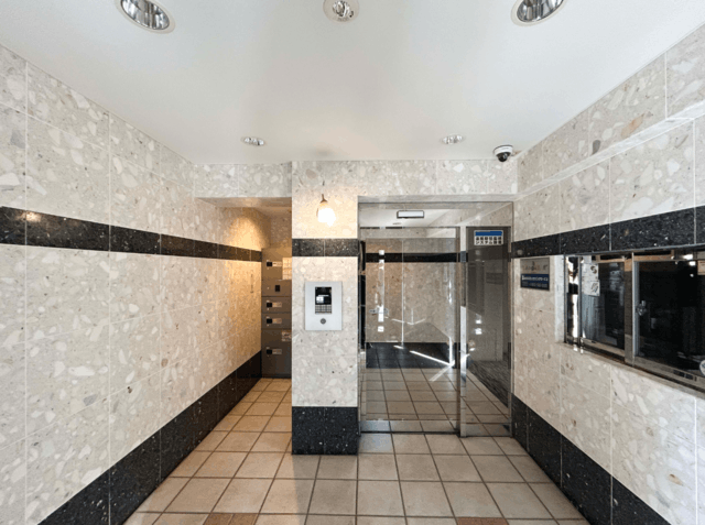 ブラウンのタイル貼りが印象的な、シックでシンプルな外観の地上5階建マンション。内廊下設計を採用しているため、雨の日も玄関前まで濡れずに移動でき、プライバシー性にも配慮されています。エントランスにはオートロックを設置し、来訪者を事前に確認可能。敷地内には防犯カメラも配置され、日常の安心をサポートします。宅配ボックスがあり、好きな時間に荷物を受け取れる便利さも魅力。ペット飼育可能(規約に準ず)で、家族の一員と共に暮らせる住環境です。