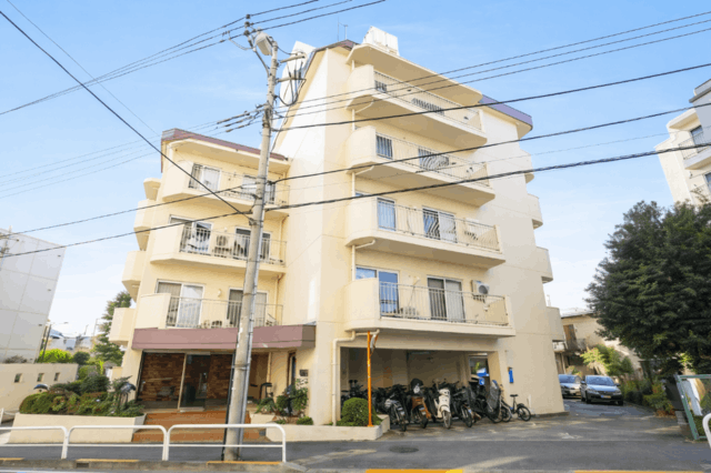 オフホワイトの外壁にブラウンのルーフがアクセントを添える、温かみのあるデザインの地上6階建マンション。1976年築ですが、2024年1月に大規模修繕工事を実施済みで、建物の維持管理がしっかりと行われています。エレベーターを完備し、日常の移動もスムーズ。防犯カメラを設置しており、日々の安心をサポートします。ペットは小鳥・観賞用魚のみ飼育可能。敷地内には駐車場、駐輪場、バイク置き場を用意しており、車両をお持ちの方も快適に暮らせます。