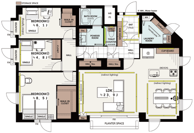 ■優しい光で空間を包む間接照明を各所に設置 (間接照明…黄色部分)