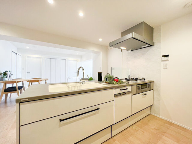 □システムキッチン新規交換(グローエ製浄水器付水栓交換/食器洗乾燥機付/水無し両面グリル付3口コンロ/人造大理石カウンター)